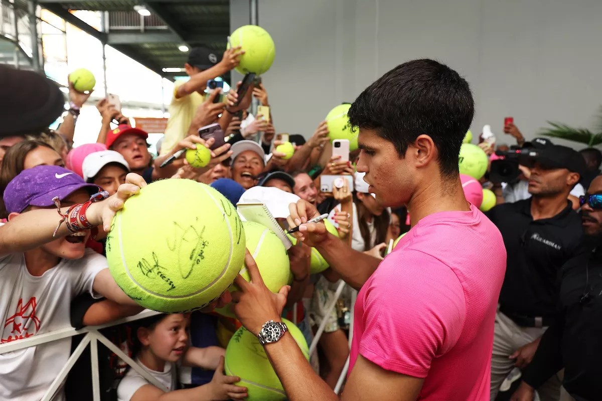 Spanish player Carlos Alcaraz interacts with fans during the 2023 Miami Open.