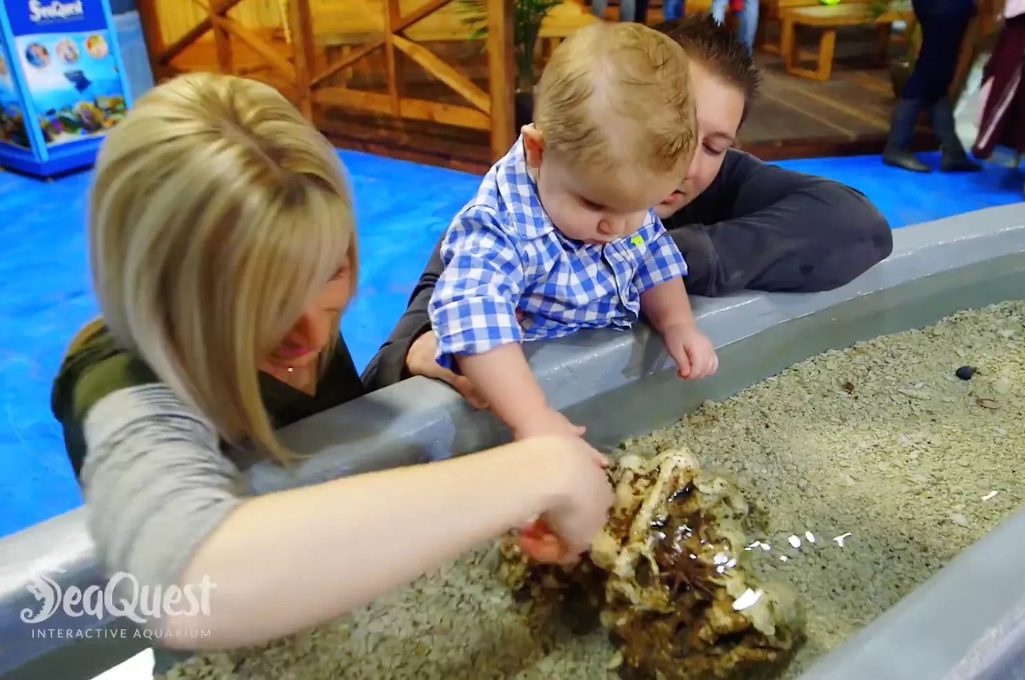 SeaQuest promo image of a staff member feeding a stingray at one of the company’s interactive aquariums.